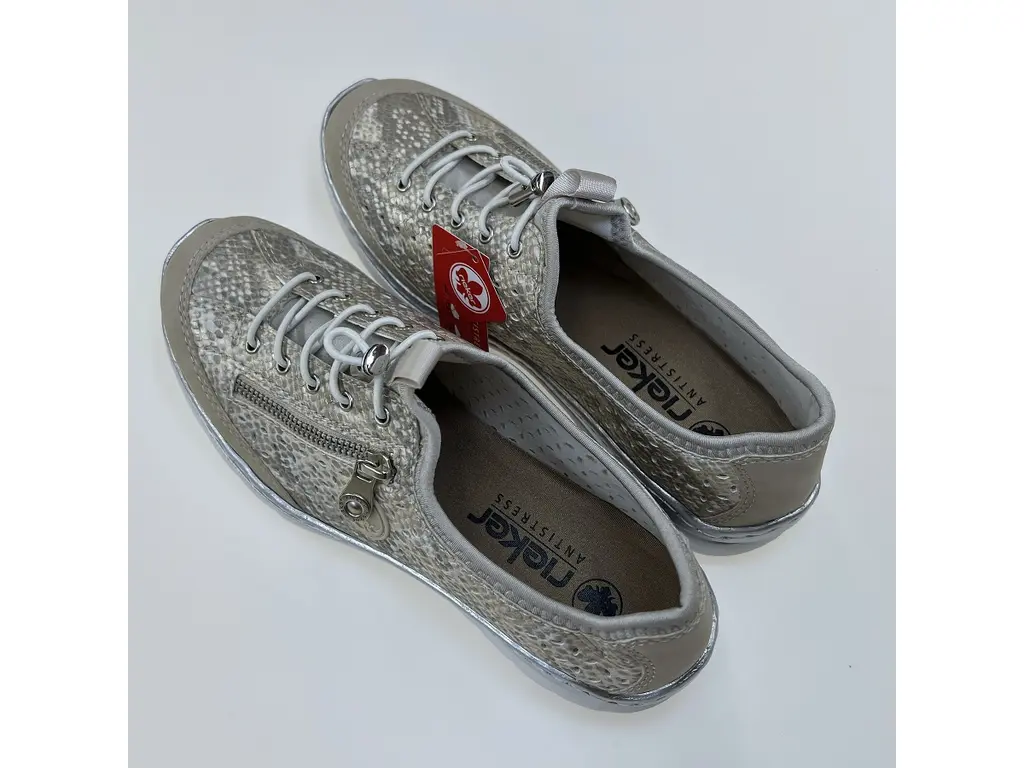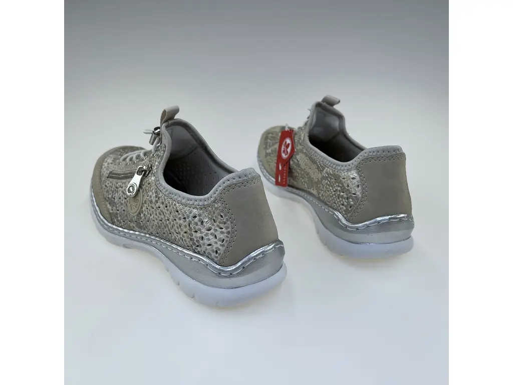 Rieker L3252-92: Zlatý štandard pohodlia pre vaše nohy Dodajte svojmu kroku oslnivý lesk a doprajte si komfort, ktorý vás nesklame! Dámske poltopánky od svetoznámej značky Rieker (vzor L3252-92) v nádhernom zlato-béžovom prevedení sú dokonalou voľbou pre ženy, ktoré chcú vyčnievať z davu, no odmietajú obetovať svoje pohodlie. Tento model spája moderný metalický dizajn s ikonickou technológiou Rieker Antistress. Či už vás čaká náročný deň v meste, alebo hľadáte štýlovú obuv na voľný čas, tieto poltopánky sa stanú vaším najobľúbenejším kúskom sezóny. Prečo si vybrať práve model Rieker L3252-92? Oslnivý metalický dizajn: Zlatistý povrch s jemnou textúrou dodáva topánkam luxusný nádych, ktorý rozžiari aj ten najjednoduchší outfit. Technológia Rieker Antistress: Špeciálna podošva je navrhnutá tak, aby bola ľahká, flexibilná a tlmila nárazy pri každom došľape. Vaša chrbtica a kĺby budú v bezpečí aj po hodinách chôdze. Mäkučká stielka Rieker MemoSoft: Vnútorná stielka z pamäťovej peny sa okamžite prispôsobí anatómii vášho chodidla. Pocit "chôdze po obláčiku" je v tomto modeli realitou. Priedušná perforácia: Jemné dierovanie na zvršku zabezpečuje optimálnu cirkuláciu vzduchu, čo udrží vaše nohy svieže aj počas teplejších jarných a letných dní. Jednoduché obúvanie: Vďaka bočným elastickým prvkom (gumičkám) topánky skvele sedia na nohe a obúvajú sa rýchlo a bez námahy.
