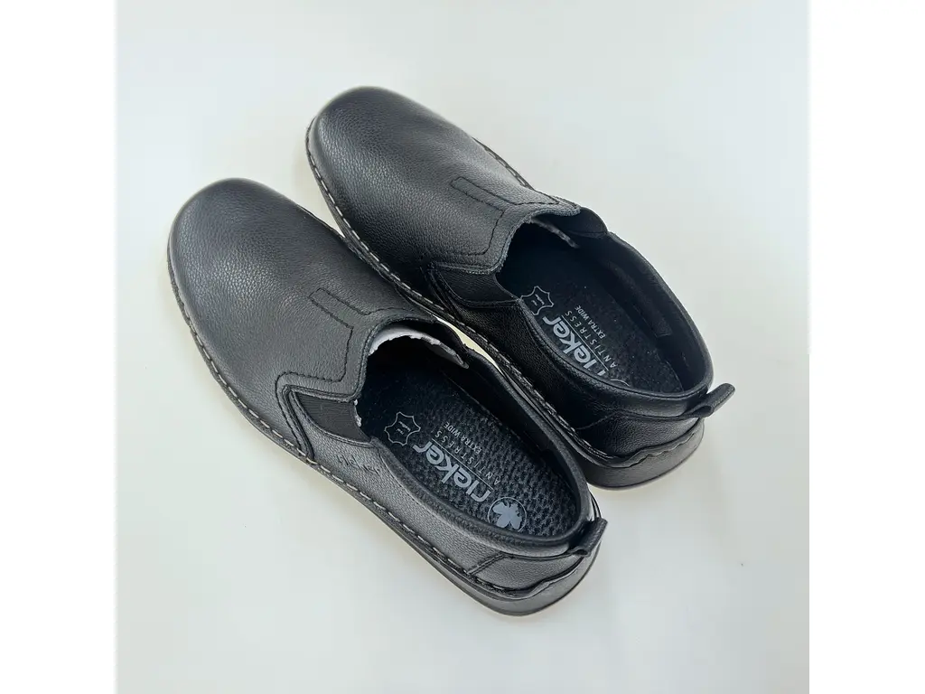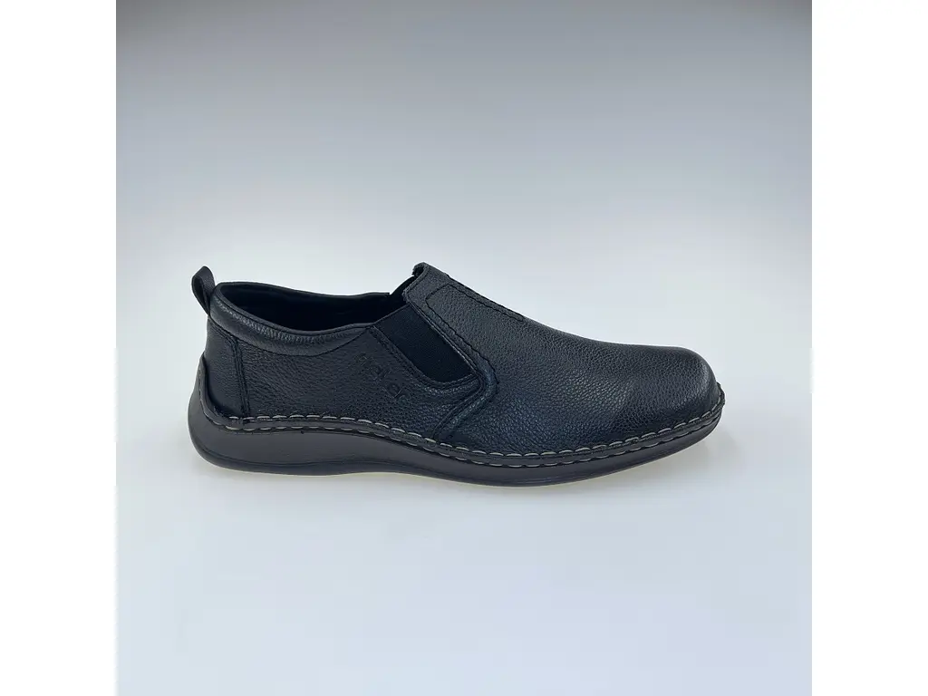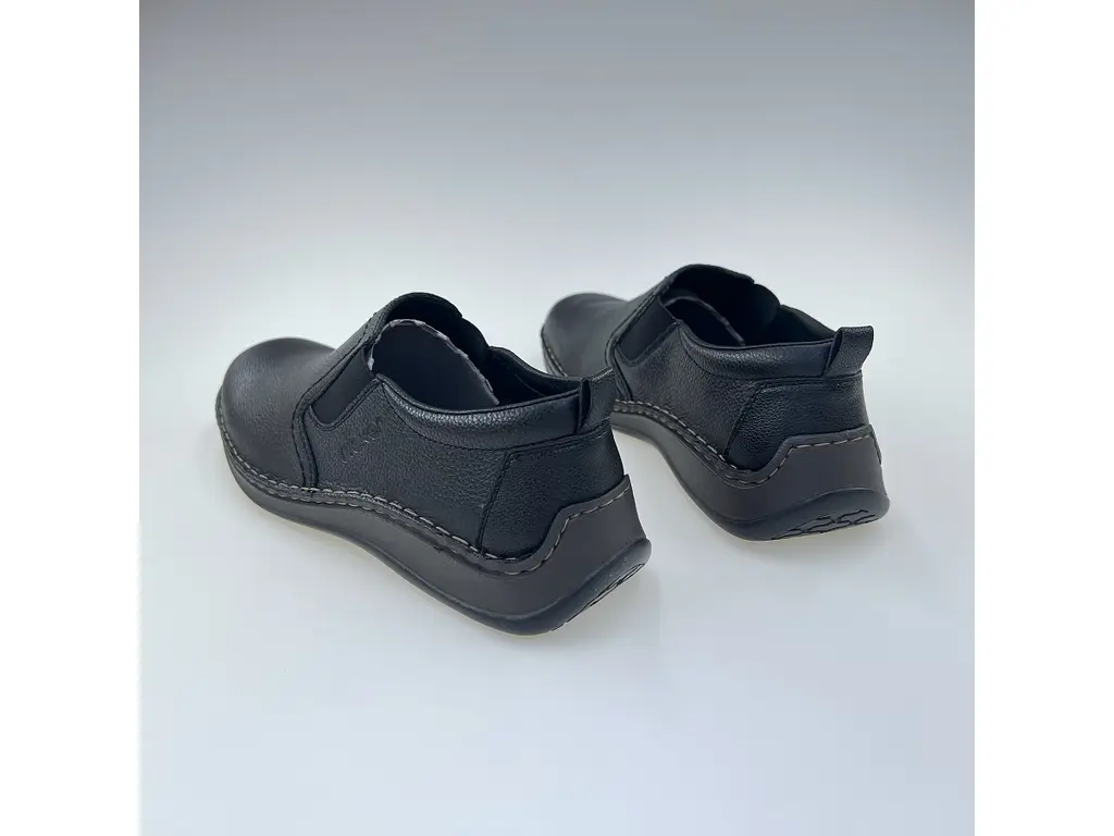 Hľadáte obuv, do ktorej ráno len vhupnete a po celý deň o nej nebudete vedieť? Pánske mokasíny Rieker 05264-00 v elegantnej čiernej farbe sú navrhnuté s dôrazom na maximálnu praktickosť a komfort. Tento model je špeciálne upravený pre širšie chodidlá, čo z neho robí dokonalého spoločníka pre pánov, ktorí odmietajú robiť kompromisy medzi štýlom a pohodlím. Prečo si vybrať práve tieto mokasíny? Extra široký strih (Šírka K): Tento model patrí medzi najširšie v ponuke, čím poskytuje výnimočný priestor pre prsty a priehlavok. Je ideálnou voľbou pre veľmi široké nohy alebo nohy so sklonom k opuchom. Technológia Antistress: Špeciálna podošva Rieker je ľahká, flexibilná a efektívne tlmí nárazy, čím šetrí vašu chrbticu a kĺby pri každom kroku. Jednoduché obúvanie: Pružné bočné gumičky umožňujú rýchle nazutie bez potreby šnurovania, pričom topánka pevne sedí na nohe. Kvalitná koža: Zvršok z výberovej prírodnej kože zaručuje dlhú životnosť, priedušnosť a časom sa skvele prispôsobí individuálnemu tvaru vašej nohy. Univerzálne využitie: Decentný čierny dizajn sa hodí k spoločenským nohaviciam do práce, ale aj k ležérnym džínsom na voľný čas.Vlastnosti