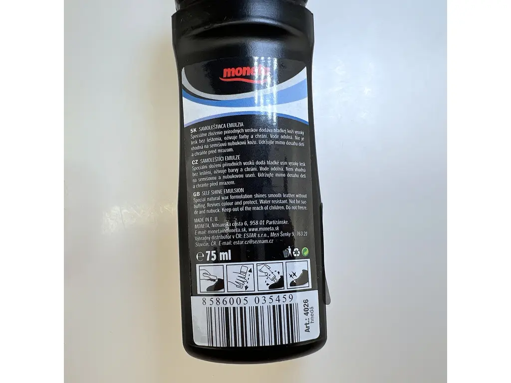 Špeciálne zloženie prírodných voskov dodáva hladkej koži vysoký lesk bez leštenia, oživuje farby a chráni. Vode odolná. Nie je vhodná na semišovú a nubukovú kožu.